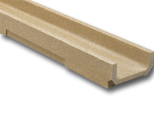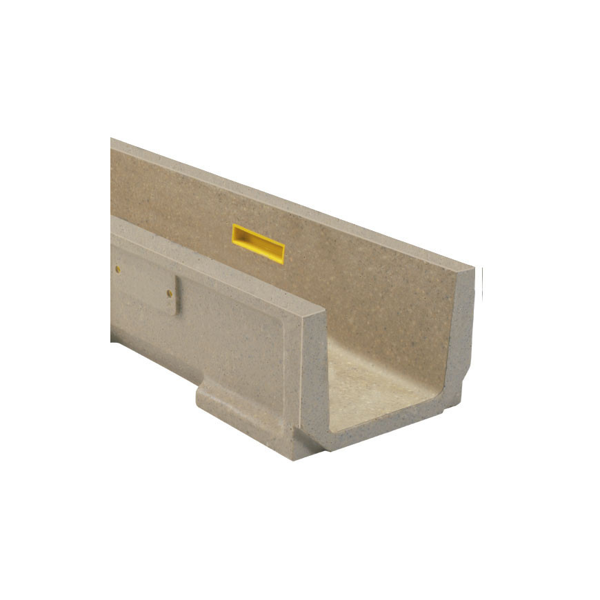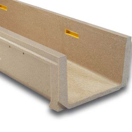 ULMA linijski odvodni kanal, tip EUROSELF V+; Vanjska širina 130 mm, unutarnja širina 100 mm; Dostupan s ukupnim visinama 95, 125 i 145 mm, duljine 1 metar, optimiziranog V-oblika s učinkom samočišćenja; posebno dizajniran za kanale bez uzdužnog nagiba. Sustav zaključavanja sastoji se od šipke za zaključavanje i vijaka.